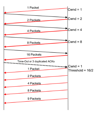 └ 네트워크 크기가 어떻게 되는지 살펴본 뒤에 그에 맞춰서 전송 속도를 최적화하여 데이터 전송 효율을 높이게 되는 것입니다. - Threshold 이후에는 Cwnd가 '1'씩 증가
